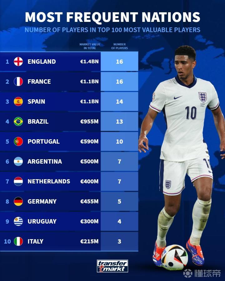 而身价排名在前十的国家中,英格兰的16名球员在前100名球员中所占比例较高,这也意味着英格兰足球人才辈出,实力雄厚。相比之下,德国排在第八位,仅有5名球员入围,总身价为4.55亿欧元,进一步凸显出英格兰在世界足坛的地位。乌拉圭、意大利等传统足球强国在这份榜单中表现平平,未能跻身前列。