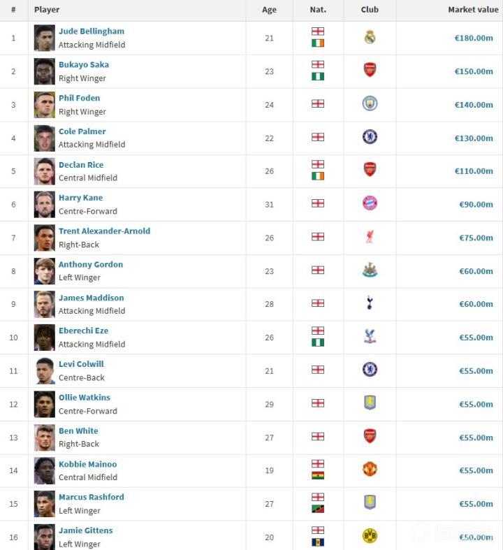 令人瞩目的是,英格兰队伍中有五位球员被誉为“亿元先生”。他们分别是贝林厄姆、萨卡、福登、帕尔默和赖斯。这五位英格兰尖子球员的总身价高达数亿欧元,成为该国足球运动的骄傲。